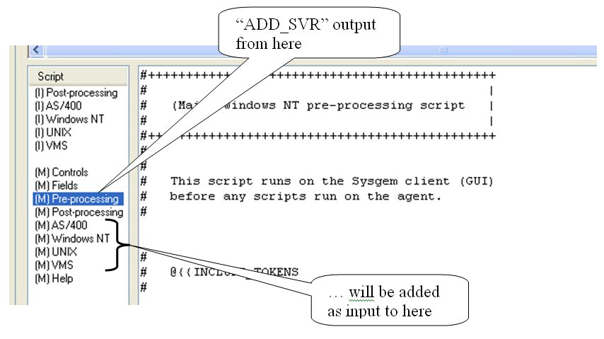 To add a variable (or even a whole set of command lines) to the main target script that runs when a Menu option has been selected, print the "ADD_SVR" output from the "(M) Pre-Processing" script as follows:
