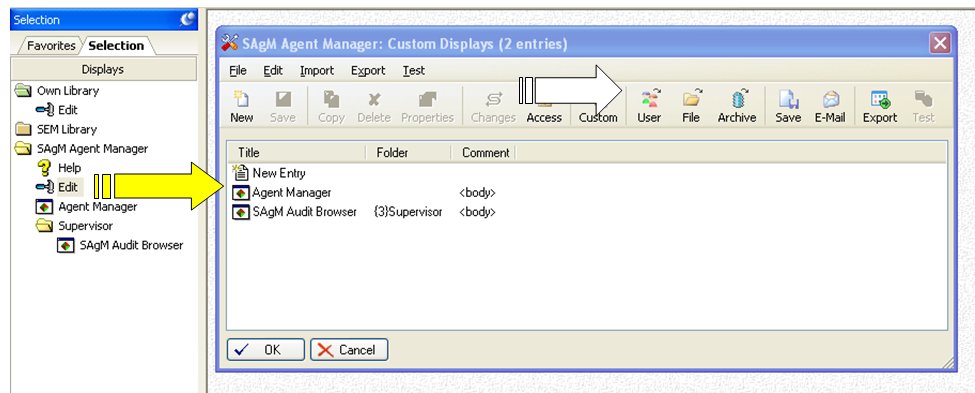 The first display shown after selecting the "Edit" (Blue hammer) option is a list of "Custom Display Windows" that are contained within the library. The example above shows that the SEM library "SAgM Agent Manager" has two custom displays: "Agent Manager" and "SAgM Audit Browser".
