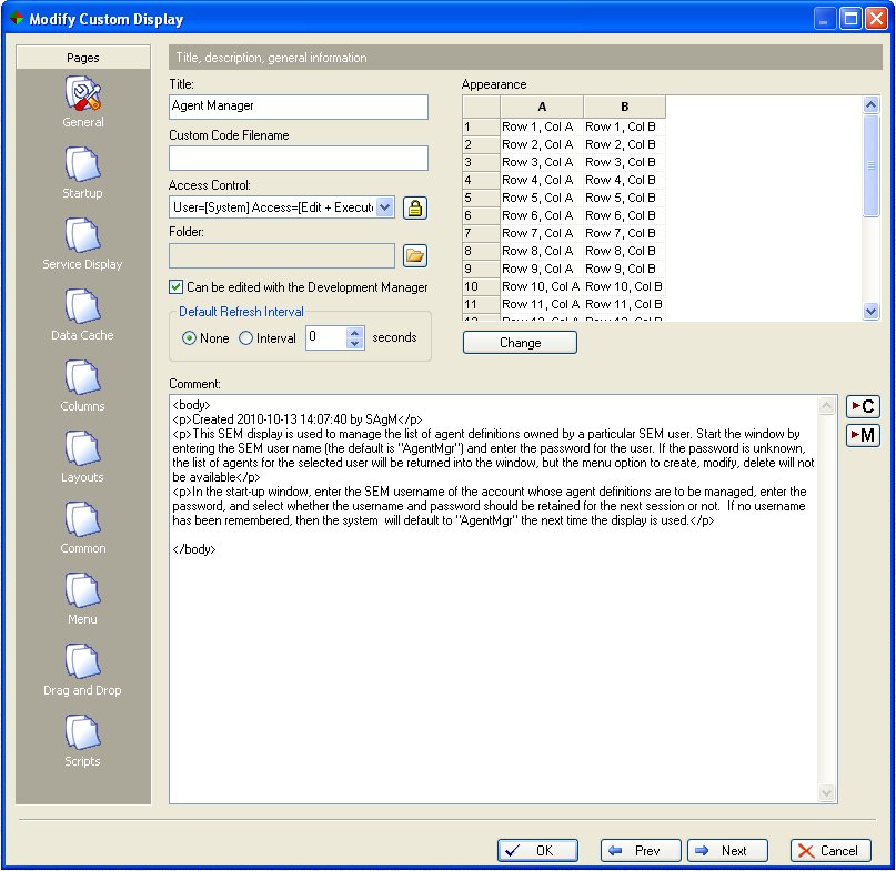 Double Clicking on the "Agent Manager" entry starts the edit session for that display window and gives the following "Modify Custom Display" window: