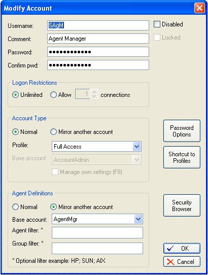 To control the definitions of SEM Agents, a SEM user can either have their own set of definitions that they manage themselves, or they can "Mirror" another account and use the Agent Defintions from that other account. It is common to have a small number of accounts (Agent Manager Accounts) that define SEM Agents and for the remaining SEM users to be mirrored to one of these Agent Manager Accounts for their agent definitions.